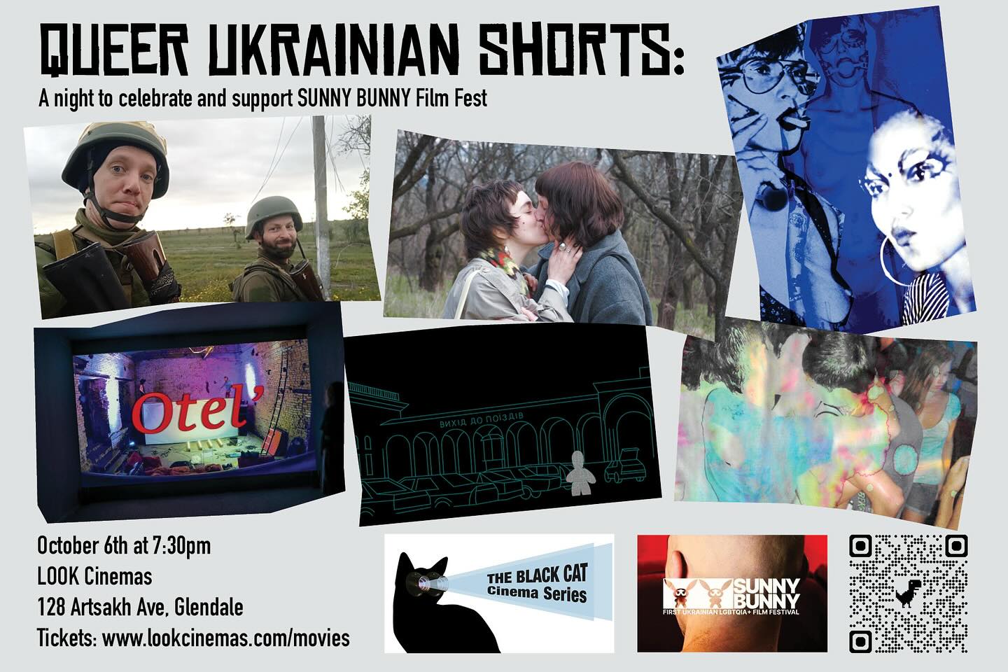 October 6th at 7:30 pm Black Cat Cinema Series presents a very special one night only screening of a selection of queer Ukrainian short films made under the duress of war. They are fearless, queer AF, gorgeous works that must be seen! Also the screening is a beautiful benefit for Sunny Bunny the Ukrainian LGBTQ film festival so please give! (Scan the QR code) also huge thanks to Paul for this wonderful poster (as well as our awesome logo)